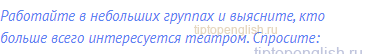 Work in small groups and find out who takes the greatest interest in the theatre. Ask: Работайте в небольших группах и выясните, кто больше if your friends have ever been to the theatre; были ли ваши друзья когда-либо в театре; what theatre(s) they go to or have been to; в какой театр они ходят или были; if they often (not very often, seldom, hardly ever) go to the theatre; как часто (не очень часто, редко, почти никогда) они if they know names of famous Russian theatres; знают ли они названия известных русских театров; if they know any names of famous Russian actors or actresses; знают ли они какие-либо имена известных российских if they can give some names of well-known Russian dramatists; могут ли они назвать имена известных российских if they can give some names of famous dramatists from other countries; если они могут дать некоторые имена известных what names of popular operas and ballets they know; какие названия популярных опер и балетов им известны; what Russian composers wrote and write music for operas and ballets; что русские композиторы писали и пишут музыку для опер what famous opera houses around the world they know and where they are situated. какие известные оперные театры мира они знают и где