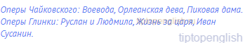 Operas by Tchaikovsky: Voivode, The Maid of Orleans, The Queen of Spades. Glinka's operas: Ruslan and Lyudmila, A Life for the Tsar, Ivan Susanin.