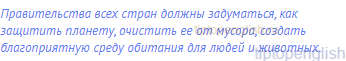Governments of all the countries of the world should think over how to protect the planet, clean it from the rubbish and create good habitats for people and animals.