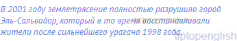 In 2001 the earthquake completely destroyed the town of El Salvador which was being rebuilt by the citizens after the dreadful hurricane of 1998.