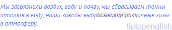 We have polluted air, water and soil, we throw away tons of wastes into the water, and our factories emit different gases into the atmosphere.